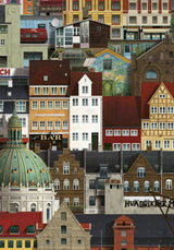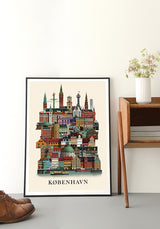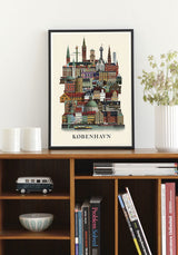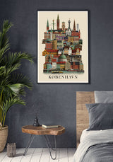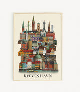 Kopenhagen (København) als wunderschönes Poster für die eigenen vier Wände. Die Skyline dieser Stadt wird am besten durch die zahlreichen Kirchtürme geprägt, die sich von den vielen roten Dächern abheben. Auf Straßenniveau treffen Sie auf eine Reihe historischer Gebäude. Das Poster würdigt nicht nur die berühmtesten Gebäude der Stadt wie Rundetårn, die Erlöserkirche und die Börse, sondern auch eher lokale Orte wie die Eiffelbar, das Central Hotel und den berühmten Graffiti-Slogan „Hva drikker Mølr“, auf dem geschrieben stand ein verlassenes Silo im nördlichen Hafenviertel.